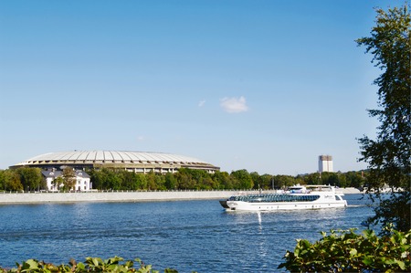 Moscow, Russia - September 16, 2014: Moscow river with pleasure boat, view of Luzneckay quay and Luzniki stadium.
