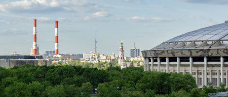 View of Luzhniki stadium from Sparrow Hills or Vorobyovy Gory observation (viewing) platform. Moscow, Russia