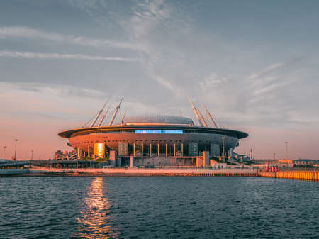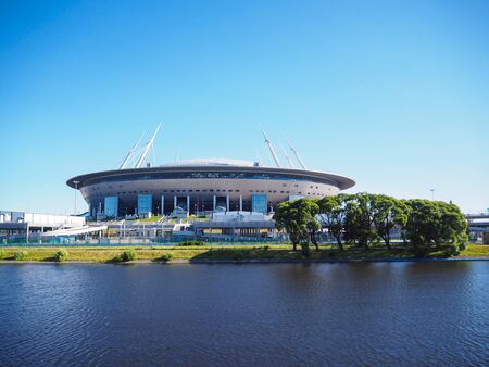 06.26.2019. Saint-Petersburg, Russia. View at football stadium Gazprom Arena (also called Zenit Arena) with water and blue sky background. It was opened in 2017 for the FIFA Confederations Cup, the FIFA World Cup 2018