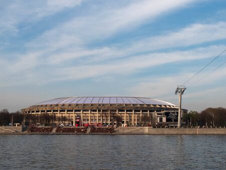 Moscow, Russia - May 2018. Moscow Luzhniki Stadium and pier of aerial cableway. View from river boat.