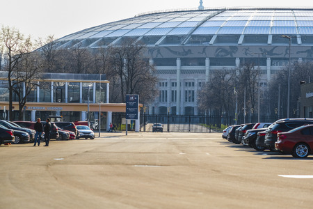 Moscow, Russia - April, 13, 2019: cars on a parking near stadium Luzniki in Moscow, Russia