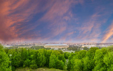 A view of the Luzhniki Stadium from Sparrow Hills at sunset. Moscow
