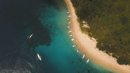 Aerial view of coast with beach in blue lagoon. Philippines, Luzon. Coast ocean with tropical beach, turquoise water. Tropical landscape in Asia.