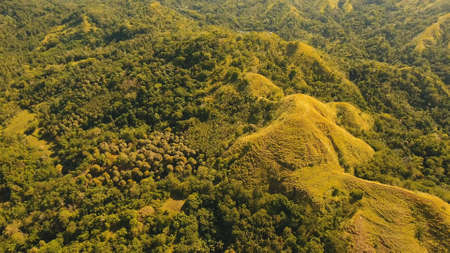 Amazingly shaped Chocolate hills on sunny day on Bohol island, Philippines. Aerial view Chocolate Hills in Bohol, Philippines are earth mounds scattered all over the town of Carmen. Travel concept.