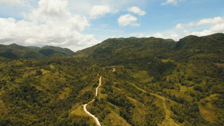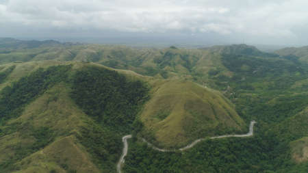 Rainforest, jungle covered with green vegetation and trees on the tropical island, landscape. Aerial view: Mountains and hills with wild forest. Hillside rainforest and jungle. Philippines, Siargao.