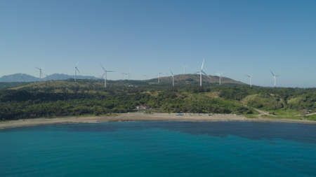 Aerial view of beach against windmills, lagoons and coral reefs. Philippines, Pagudpud. Ocean coastline with turquoise water. Windmills in Ilocos Norte, Philippines. Tropical landscape in Asia.