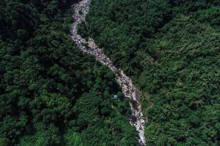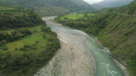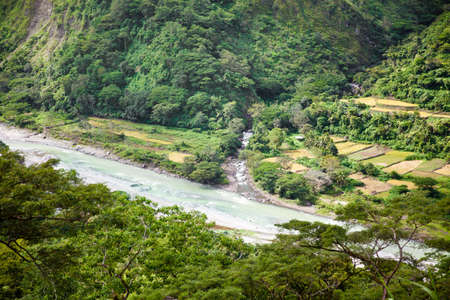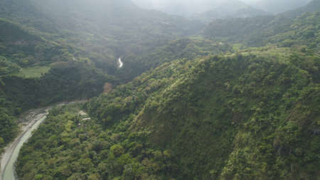 Aerial view of mountain valley in the cordillera, river, rice terraces, farmland in the Philippines, Luzon. Aerial view of mountains covered forest, tree. Cordillera region.