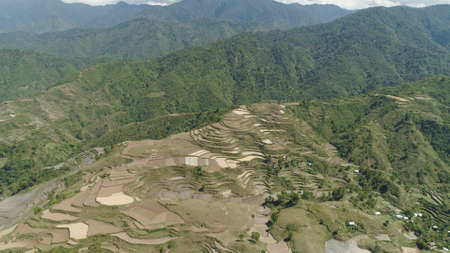 Aerial view of rice terraces and agricultural land on the slopes of the mountains. Village of farmers near rice fields in mountain valley. Mountains covered forest, trees. Cordillera region. Luzon, Philippines.