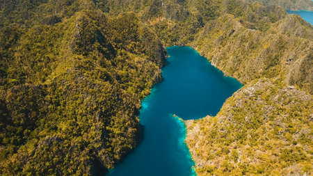Aerial view:Mountain Kayangan lake,on a tropical island with blue water. Lake in the mountains covered with tropical forest on the island Coron, Palawan, Philippines. Travel concept