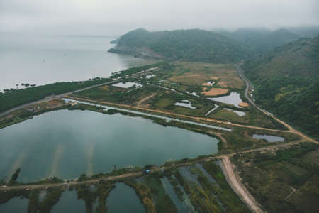 Top view of the wetlands of the island of Cat BA near the sea on land. Morning gloomy landscape of the countryside of Vietnam.