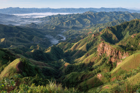 Serene Mountain Vista: Lush Green Hills and Distant Villages at Sunrise