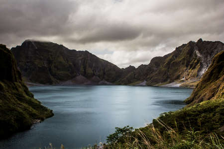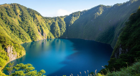 Still lake in mountains surrounded by green forest. Summer outdoor landscape. Sunny day at mountain lake. Volcanic island tropical nature view. Summer travel banner template. Hiking adventure
