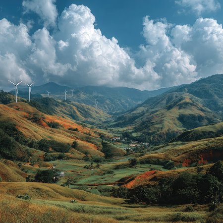 Panoramic photo of wind turbines on rolling hills in Thailand, with lush greenery and red soil, set against a beautiful sky, creating a cinematic scene. --chaos 30 --stylize 750 --v 7 Job ID: 1247dd4c-fbd9-427f-ad0b-457fe7115de0