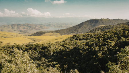 A panoramic view of rolling green hills and dense forests under a clear blue sky with scattered clouds.