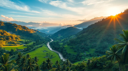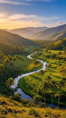 A serene landscape of a winding river through a tropical valley at sunset