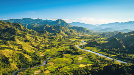 A beautiful landscape shows a river gracefully flowing through vibrant greenery and rolling hills.