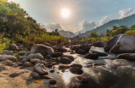Beauty nature landscape. River in a mountain gorge. Water flow. Tropical trees and mountain river in the Jungle. The nature of the Philippines. Large stones in the river.