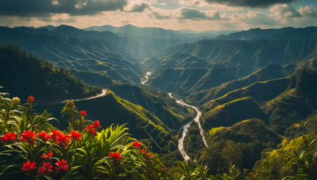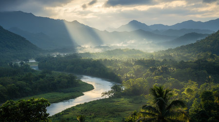 A Breathtaking landscape featuring river winding through lush green mountains, illuminated by soft sunlight breaking through clouds. serene and tranquil scene