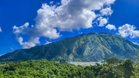 Green Mountain Meets Blue Sky: A Scenic Landscape with Lush Vegetation and Fields Under the Clouds