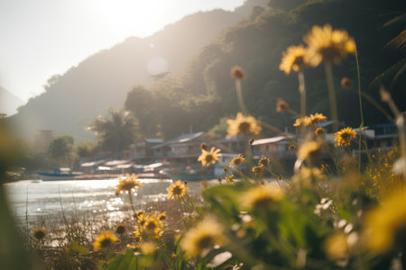 Beautiful yellow flowers on the bank of the river at sunset.