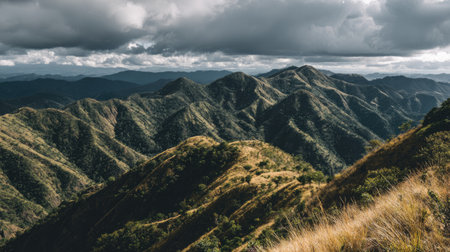 A stunning view of a mountain range showcases rich green forests and dramatic clouds, perfect for nature lovers and those seeking inspiration from the outdoors.