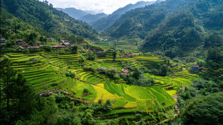 A stunning view of terraced rice fields showing vibrant green patches of farmland nestled among majestic mountains, symbolizing rural beauty and agriculture.