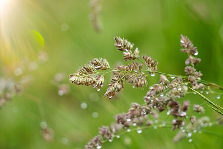 The sun's rays fall on the lush green grass. Natural texture and background.