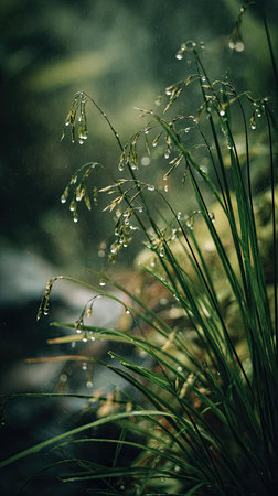 Soft rain falling gently on Scallion, with water droplets forming and slowly dripping. The background is softly blurred with natural, moody atmosphere.
