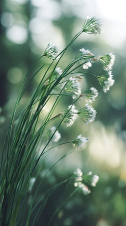 A detailed photograph of a single Garlic chives, swaying gently in the wind, captured in natural daylight. Fresh and airy atmosphere, soft motion blur on leaves, crisp details on textures, background softly blurred into natural greenery, cinematic natural light, realistic photography.