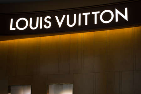 Singapore - February 17, 2017: Glowing logo of Louis Vuitton store by Marina Bay in Singapore. The luxury fashionable store in Singapore is a popular tourist attraction of Asia.