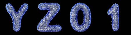 Realistic 3D letters set Y, Z, 0, 1 made of blue plastic. Collection symbols of plastic with abstract holes isolated on black background 3d rendering