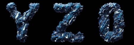 Set of capital letters Y, Z, 0 made of ice isolated on black background. 3d rendering