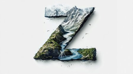 The letter Z appears as a mountain with a flowing river cutting through its center, creating an illusion of a natural landscape, all set against a clean white background.