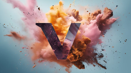 Colorful explosion of powder with letter V on a blue background.