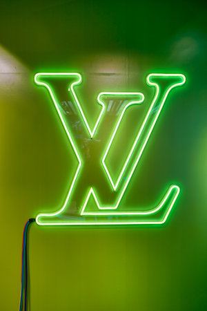 Miami, USA - March 20, 2021: Louis Vuitton name lit up on shop window at design district in Florida