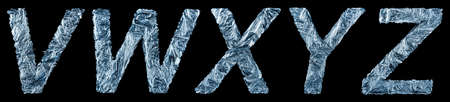 Part of the unique letters of the Latin alphabet - V, W, X, Y, Z in the form of frozen winter patterns isolated on a black background. Concept of the Christmas alphabet in frozen drawings.