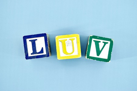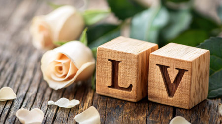 Two wooden blocks with letters L and V on a wooden surface surrounded by rose petals