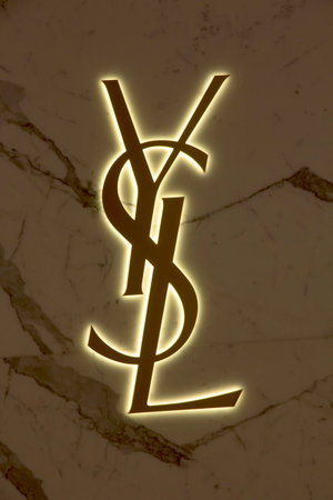 Bangkok, Thailand-May 17th 2014. The Yves Saint Laurent logo on a store in the Embassy Mall. The brand was founded in 1961by Pierre Berge and Yves Saint Laurent who died in 2008.