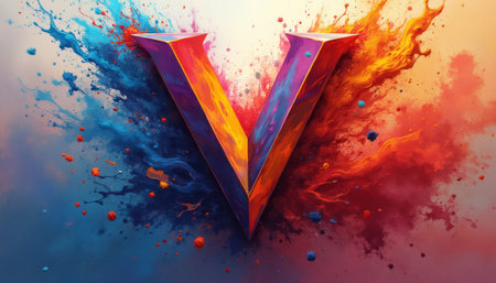 A striking letter V bursts forth from a vivid explosion of blue and orange hues, creating a dynamic visual impact. The interplay of colors evokes energy and creativity, making it perfect for modern design projects or branding.