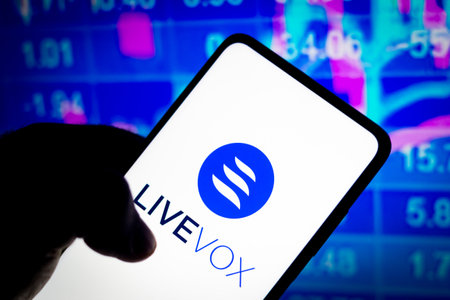 Closeup of male hand holding smartphone with logo lettering of vinted on screen