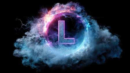 An illuminated letter L is centrally positioned within a glowing circle of energy, surrounded by wispy clouds and dynamic smoke effects. The color palette features a blend of vibrant blues, purples, and oranges against a dark background, creating a dramatic visual impact. This imagery could be suitable for digital design projects or graphic illustrations.