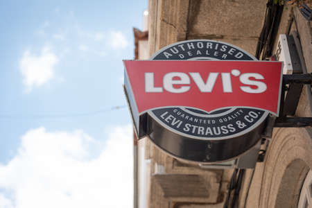 Ferrol / Galicia / Spain - 08 08 2020: Levi's Strauss logo and sign in store facade with sunny sky copy space. Levi's Strauss & Co. is an american clothing company known worldwide for its denim jeans