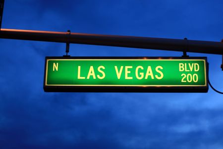 Las Vegas Blvd. road sign hangs from a traffic light pole in Las Vegas, Nevada, USA.