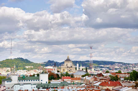 Lviv City skyline. Central part of the old city of Lvov against clouds and the blue sky. Ukraine