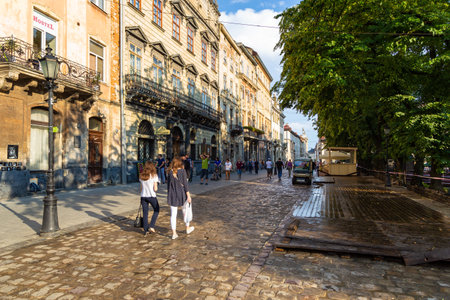 Lviv, Ukraine - 08 June 2018: Traditional buildings in a cobblestone street in historical Old town of Lviv.