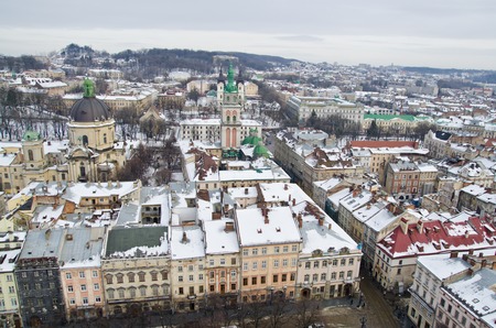 Winter panorama view from the Town Hall on the downtown in Lviv, Ukraine. Old buildings. Roofs covered with snow