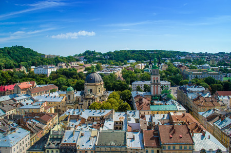 Beautiful view of the Dominican Cathedral, the Assumption Church and the historic center of Lviv, Ukraine, on a sunny day