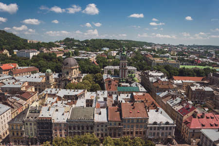 Panorama of eastern side of the Rynok Square and east part of Old Town from the tower of city town hall in Lviv, Ukraine