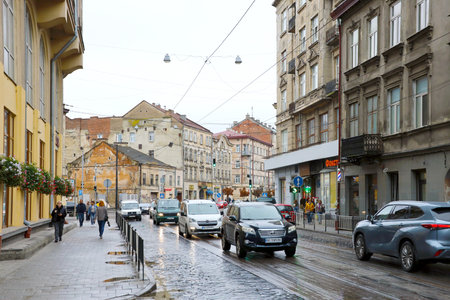 LVIV, UKRAINE - SEPTEMBER 11, 2022 Street view of the historical old city in Lviv, Ukraine. Many old buildings and facade ornaments in tight european style streets of Lviv