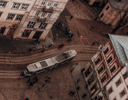 LVIV, UKRAINE - OCTOBER 23, 2019: aerial view of tram crossing crossroad and people walking on street
